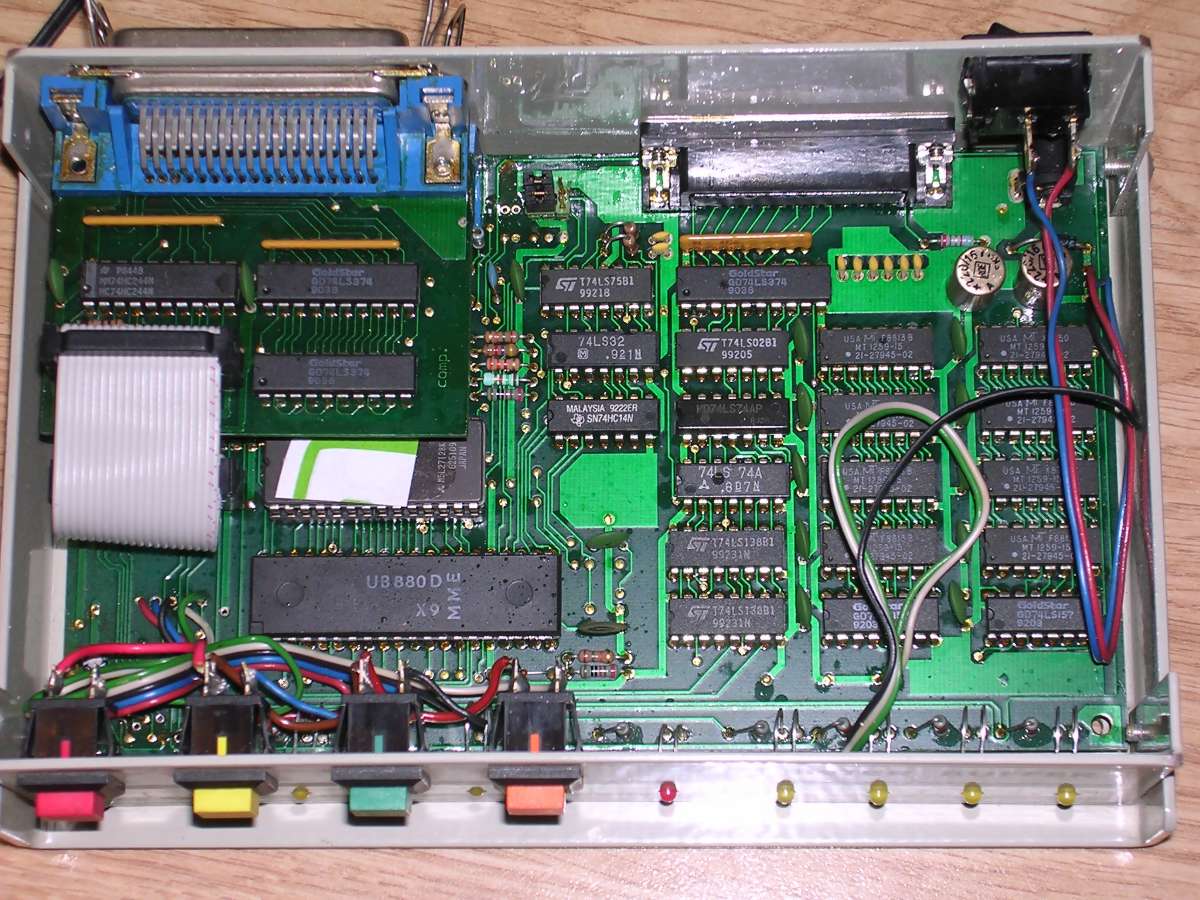 Information: A more advanced parallel port switch, based on digital circuits. It has a simple monitoring circuit which constantly scans all ports and, if data is coming on one, stops on it. This circuit can be deactivated and switching is then done manually.