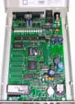 Inside, it's driven by Intel microcontroller + Lattice PLD. Serial port lines states can be seen in LEDs.