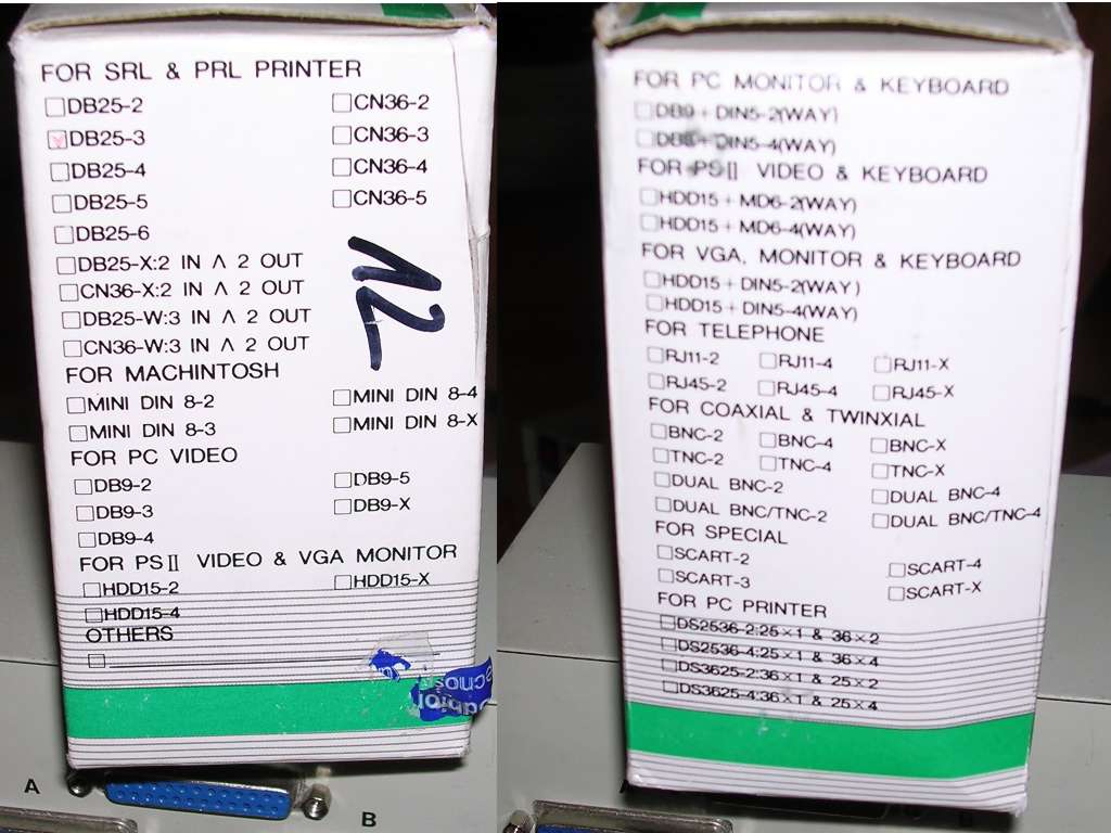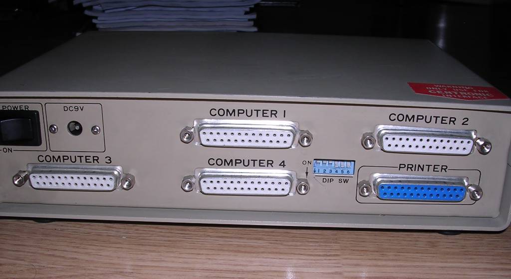 You have one computer and a few printers. Or one printer and a few computers. A very frequent problem, especially in 1990s offices without flexible computer networking (or "network" based on floppy disks). What to do? Use printer switch! A small box switching one port between few sockets. With such boxes many computers can be connected to one printer or many printers to one printer port. First, they were purely mechanical, but later became electronic and sometimes had additional buffers or converters.