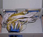 Switches in my main computer. The left one controls parallel port between printer, old computer and Willem EPROM programmer (the free one is used for bsd programmer to AVR chips). The right one controls serial port between IC tester, 8-bit CP/M machine and 2 free connections. The second picture shows how DB9-to-DB25 serial converters are used in old parallel port switch to make it switch serial port. You can use commercial-grade changers or just copper rods of specific thickness - remember to secure them properly as they may like to fall inside holes.