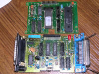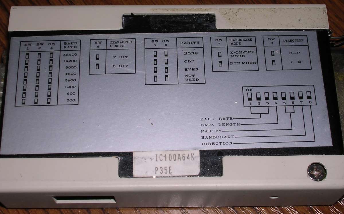 This small adapter, powered by 9V DC, allows to connect serial printer to parallel port or vice versa. Its buffer allows to cope with bandwidth problems for a moment. I don't have more information about its operation. Inside, it's based on Intel 8031 microcontroller with external EPROM and 64kB of RAM for buffering incoming data. These devices were rarely used and mostly in industrial systems, where it was needed to replace old serial printer with parallel one.
