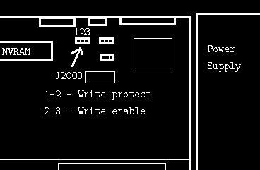 The first thing is to update BIOS. In Solaris 7 installation CD, OpenBoot update package is just present with system distribution and it will be started at first system boot if needed. If update cannot proceed and restarts every time (error like "Couldn't determine Flash PROM Component type"), you may have flash ROM protection jumper set (1-2 position). You have to power the computer off, turn the jumper J2003 to 2-3 position, power it back on, update the firmware, power the computer off and place the jumper back in "protect" position. The location of J2003 is shown in the picture. To access it, you usually have to remove video card. Remember about unlocking the rods near graphics card's connector by pulling them upwards. Generally it is quite difficult to place this graphics card properly. |