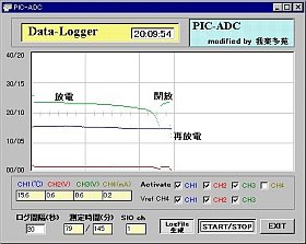 大体の放電時間と、監視用LEDがホントに目安になるか?を確認するために、例のデータ・ロガ(今回ちょびっと部分手直し)で調べてみました。
