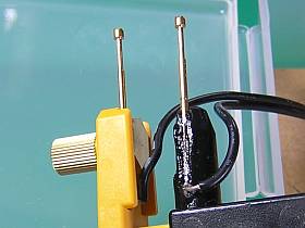バネ内蔵の伸縮ピンは、片方は既存の金具を利用して止め、もう一方は細ヤスリで溝を作り、そこへピンを加熱しながら埋め込んで、上から瞬間接着剤で固定。