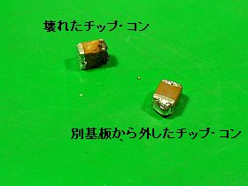 壊れたチップ・コンは、電源用らしく結構大きいので、外すのに苦労。_お蔭で、基板のパターンまで剥がしそうになった_