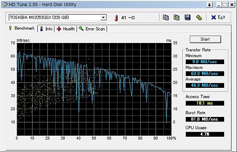 先の「HDBENCH」のALL値では、あまり分からなかったが、「HD Tune」のベンチマークで見たら、劣化が進んでいるように見えた。