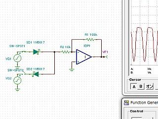で、考えた回路を描いて、「仮想ジェネレータ」から信号を出して、その出力波形を「仮想オッシロスコープ」でみた。(図3)