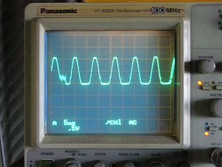 今は、Sin波なので、それが、出力としてどのようになるかをオシロスコープで見た。プローブの倍率を1/10にしてあるので、0.5Vは5Vを意味している。(図5、図6<クリック>)