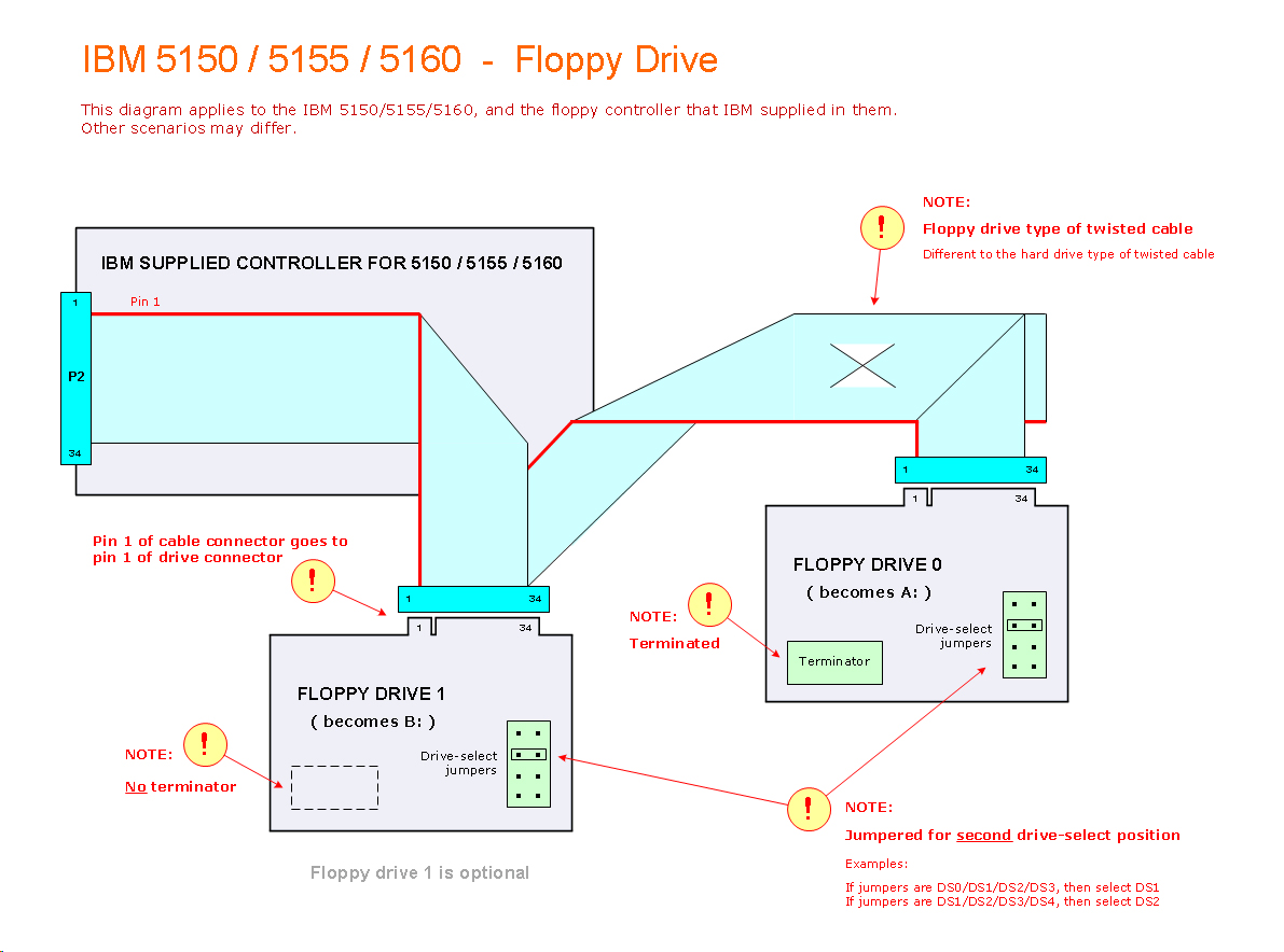 • You need to use the particular cable shown at here. The IBM controller expects it. The cable manipulates both the motor-on and drive-select lines.