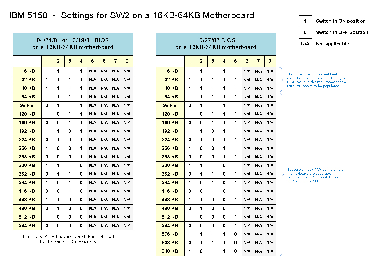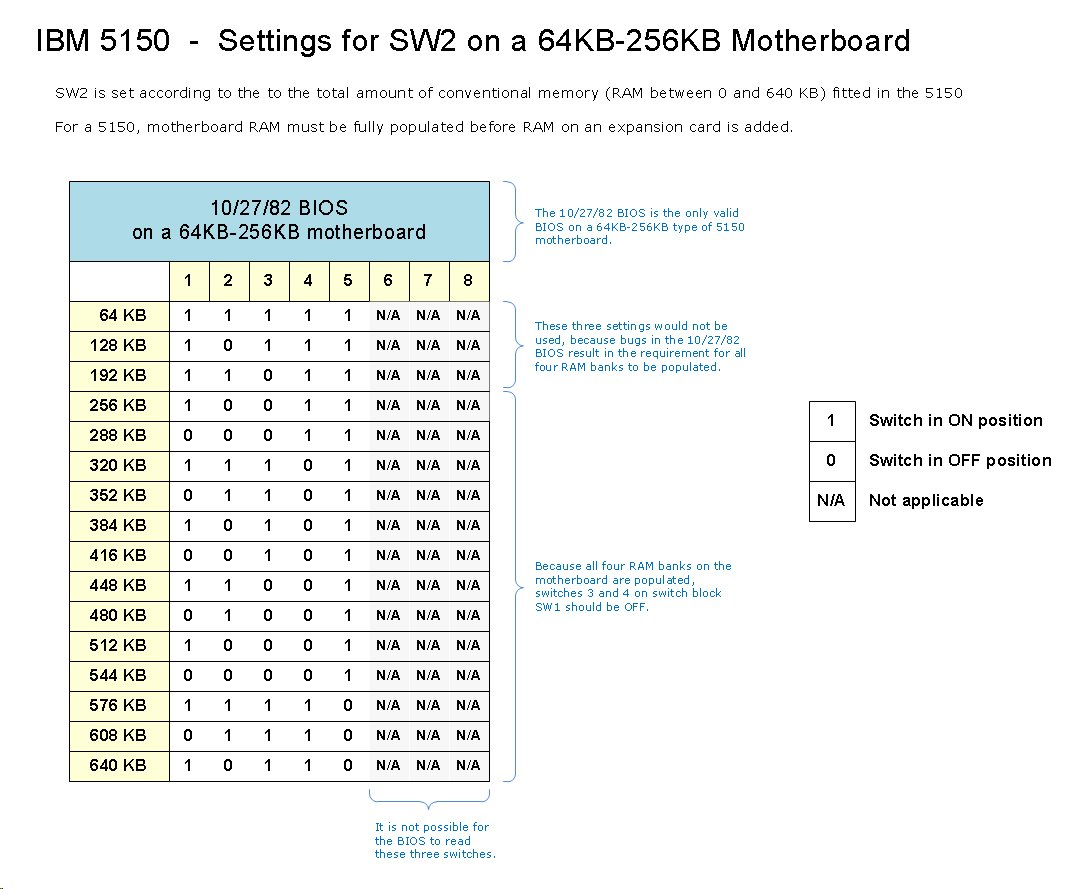 • In a 5150, these switches do not enable/disable RAM. They inform the BIOS of bank population.