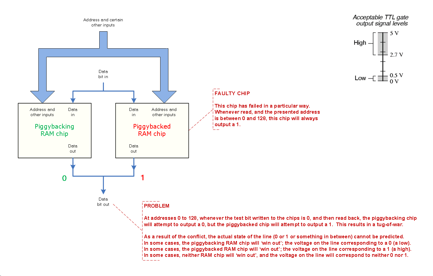 * RAM chips can fail in different ways. The piggybacking technique is not effective on chips that have failed in particular ways. One example is shown here.