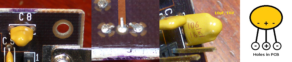 For the cards wired for the two-legged version of C8, a replacement two-legged tantalum capacitor should be easy to locate. |