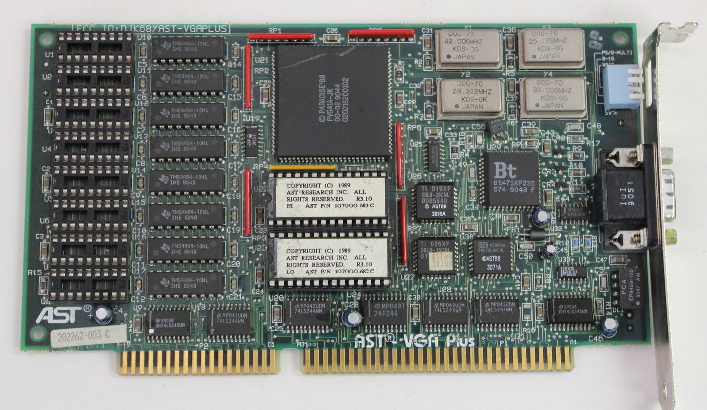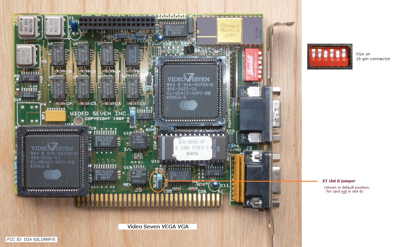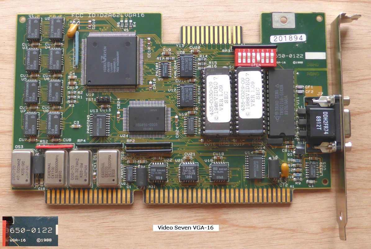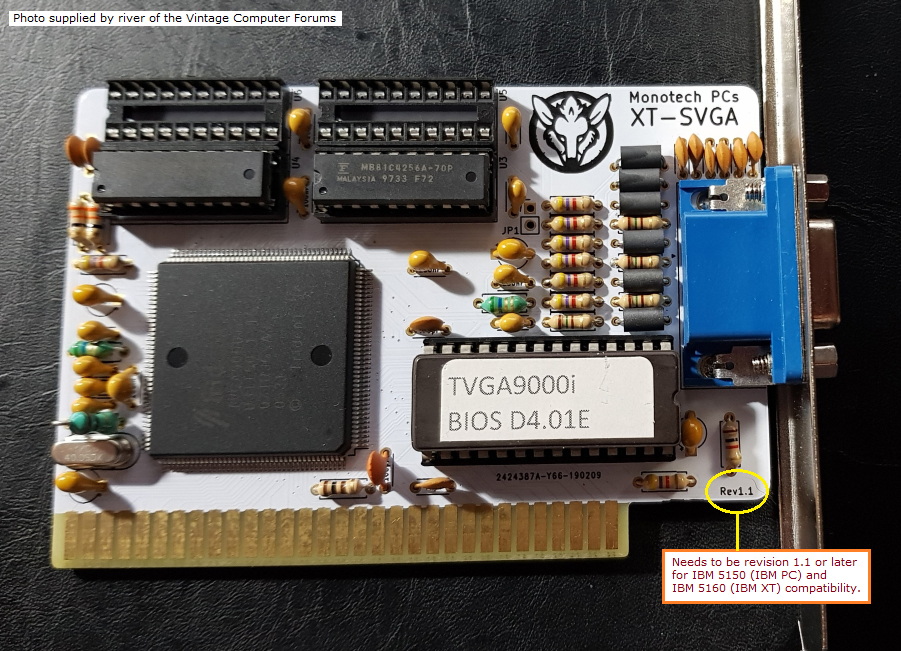 Note 2 | I have one of these cards. The VGA-16 user's guide indicates 5160 (IBM XT) compatibility, and indicates how to force the card into 8-bit operation. But whilst I can get my card to operate in a 16-bit slot, I have been unable to get my card to operate in 8-bit mode (fitted to a 5150/5160/5170). Maybe my card is faulty. Also, I have noted that the user's guide indicates an FCC ID of D2A62LTJWBJC, whereas my card has the FCC ID of D2A62LVGA16. Maybe I have a later version of the card, in which 8-bit operation was dropped! |