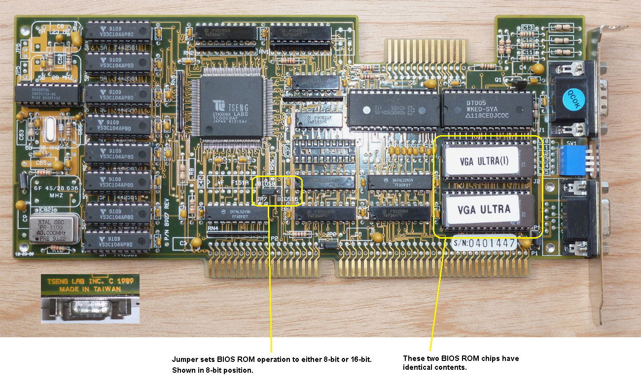 Note 1 | Printed on the PCB is, "TSENG LAB INC." and "P/N 8927". On power up, the card displays, "VGA-4000". Set the BIOS8/BIOS16 jumper to BIOS8 (force BIOS ROM reads into 8-bit mode). |