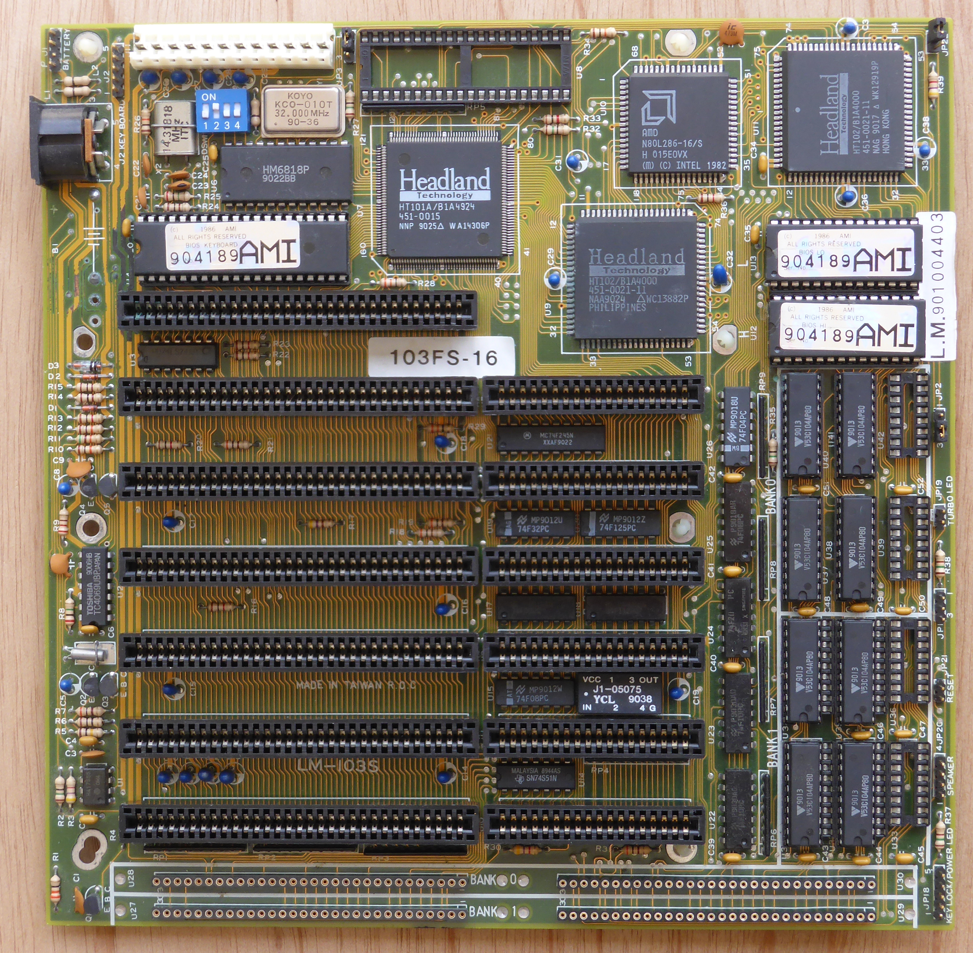 Comments | 1. Motherboard is marked "LM-103S" between two of the slots and has a "103FS-16" sticker. 2. BIOS consists of a LO chip and a HI chip (low and high) 3. A 12MHz version on eBay had a Quadtel BIOS (labelled: QT-102 V3.05.1) (photo) |