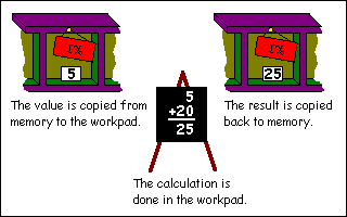 Anyone from a strict mathematical background might think this doesn't make sense. How can I% be equal to I% plus 20. In a computer language, this is perfectly legal. When BASIC does a calculation, it uses a scratchpad area. What it does is get the current value from I%, put it in this working area and add 20 to it. Then it takes the result and puts it back in the variable location called I%.