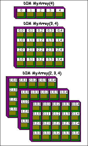 If you think of a two dimensional grid as a page, we've just declared 11 pages, each containing a grid 11 elements square. If you're working with the demo version, arrays are a superb way to run out of memory. Think about it, there are 11*11*11 = 1331 elements in this array, so just be wary before getting too carried way. Realistically, unlike some other BASICs, with BB4W you can declare as many dimensions as you want, but in practice programmers rarely use more than 3.