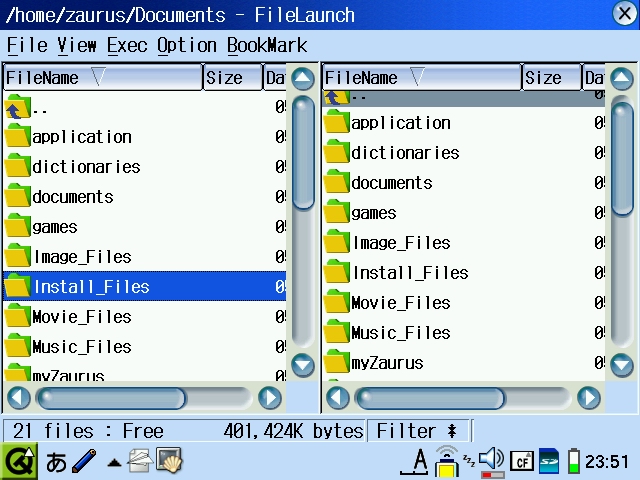 Connect the Zaurus via USB (make sure to plug the USB cable into the PC first, then the Zaurus). Copy the terminal ipk file [qpe-terminal-ja_1.5.0-3_arm.ipk] from the CD-ROM into the /Documents/Install_Files directory. Disconnect the USB device on the PC. The Zaurus will turn back to normal mode. Click on the third TAB on the top and then click on the little disk like icon. Then select the Install_Files folder. Inside, click on the ipk file (should be the only file there) and the installer will launch it. Press install (the big button at the bottom) and then OK (the button on the left) on the dialog box that comes up.