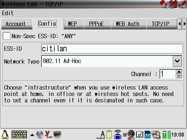 Account Name: wellenreiter Config Non-Spec ESS-ID: "ANY" (unticked) ESS-ID: test Network Type: 802.11 Ad-Hoc WEP Key Type: Disabled PPoE Use PPoE Authentication (unticked) WEB Auth Use WEB Authentication (unticked) TCP/IP Obtain TCP/IP information Automatically (unticked) IP Address: 1.1.1.1 Subnet Mask: 255.255.255.0 Gateway: 1.1.1.0 DNS Auto-detect name servers (ticked) Default domain: (leave empty) Proxy No proxy |